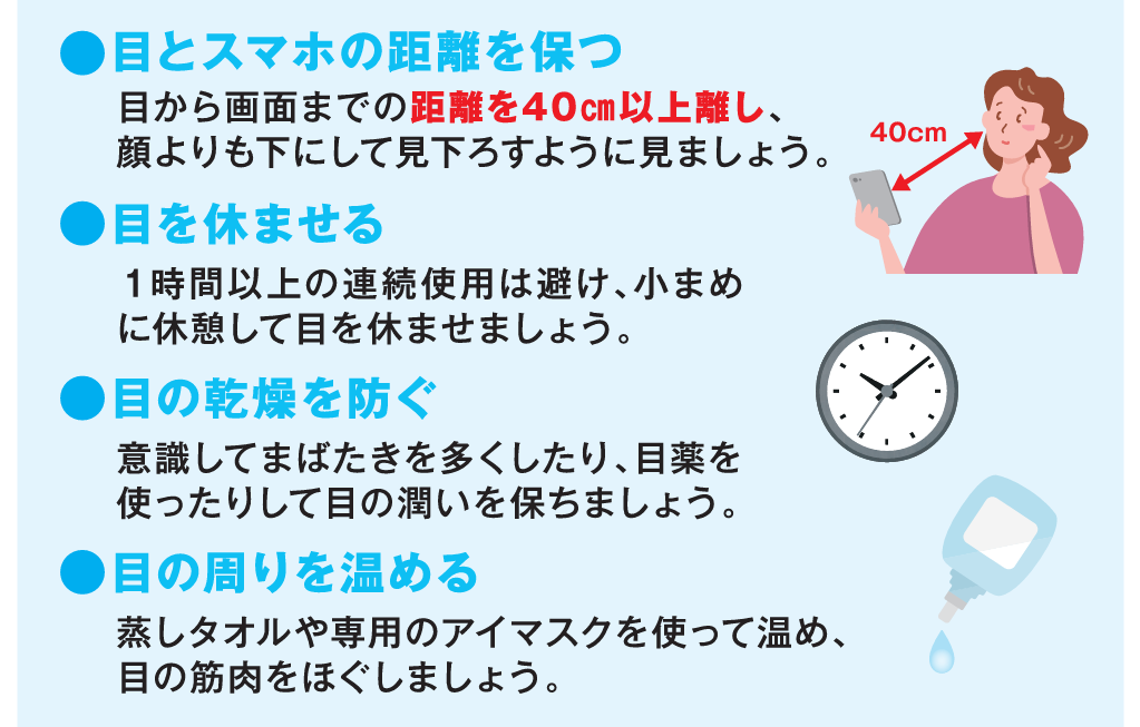 至近距離でIT機器(スマホやパソコン等)の明るい液晶画面を長時間凝視することによって、まばたきの減少やブルーライトの影響を受け、眼精疲労、ドライアイなどの目の症状だけでなく、前述のような全身にさまざまな不調が出ることです。